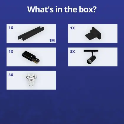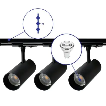 Beschreibung Komplettset 1-Phasen Rail 1 Meter Schwarz | incl. 3x Spot + GU10 2700K 3W Dimmbar + Abschlusskappe, Stromanschluss