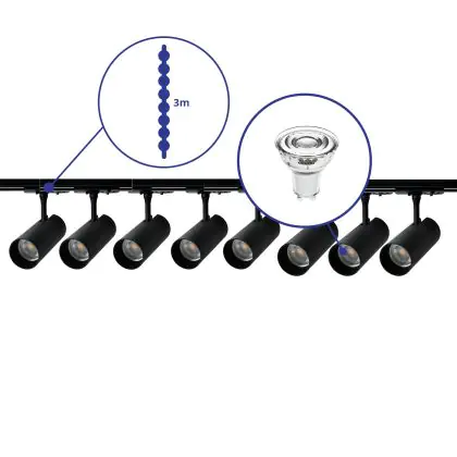 Beschreibung Komplettset 1-Phasen Rail 3 Meter Schwarz | incl. 8x Spot + GU10 2700K 3W Dimmbar + Abschlusskappe, Stromanschluss und I-Verbinder