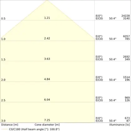 Beispiel: Wird eine Lampe mit einem Abstrahlwinkel von 60 Grad an der Decke (2,5 m Höhe) angebracht, erzeugt sie einen Lichtkegel von 2,9 Metern Durchmesser. Hat die Lampe hingegen einen Abstrahlwinkel von 120 Grad, beträgt der Lichtkegel 8,7 Meter im Durchmesser. |