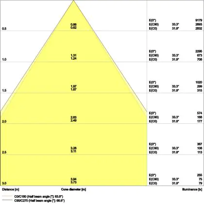 Beispiel: Wird eine Lampe mit einem Abstrahlwinkel von 60 Grad an der Decke (2,5 m Höhe) angebracht, erzeugt sie einen Lichtkegel von 2,9 Metern Durchmesser. Hat die Lampe hingegen einen Abstrahlwinkel von 120 Grad, beträgt der Lichtkegel 8,7 Meter im Durchmesser. |
