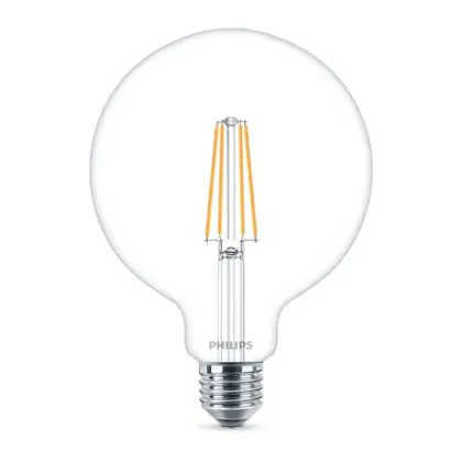Die Philips Classic LED Globe E27 Fadenlampe Klar 120mm 8W 806lm - 827 Extra Warmweiß | Dimmbar - Ersatz für 60W ist eine effiziente E27 LED-Lampe mit Retrodesign und der perfekte Ersatz für Ihre konventionellen 60W Lampen mit E27. Zudem strahlt sie Licht in der Farbtemperatur 2700K - Extra Warmweiß aus und punktet durch eine lange Lebensdauer.