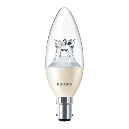Die Philips LEDcandle B15 B38 6W 827 Klar (MASTER) | DimTone Dimmbar ist eine besonders effiziente B15 LED-Lampe. Die Filamentlampe ist nicht nur optisch ein schönes Highlight, sondern überzeugt auch mit hochwertiger LED-Technik und einem extrem geringen Energieverbrauch. Weiterhin ist die LED-Lampe per DimTone-Funktion dimmbar.